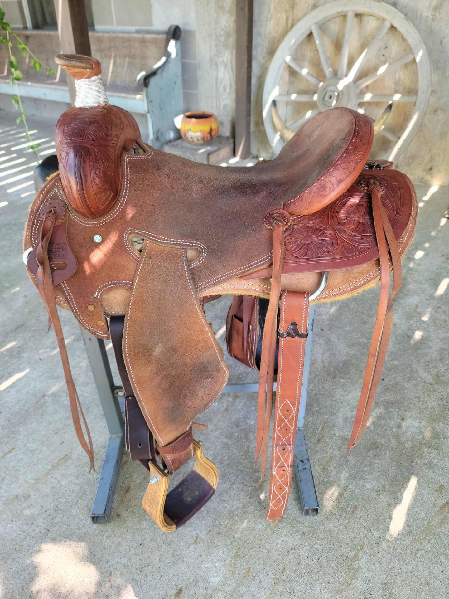 Used 16" Robert Teskey Rancher, seat rig, close contact, roughout seat jockey n fenders, roughout bottom skirt, strip down, lightly ridden, here is an everyday working saddle, built to last, lot of saddle for the money!!!