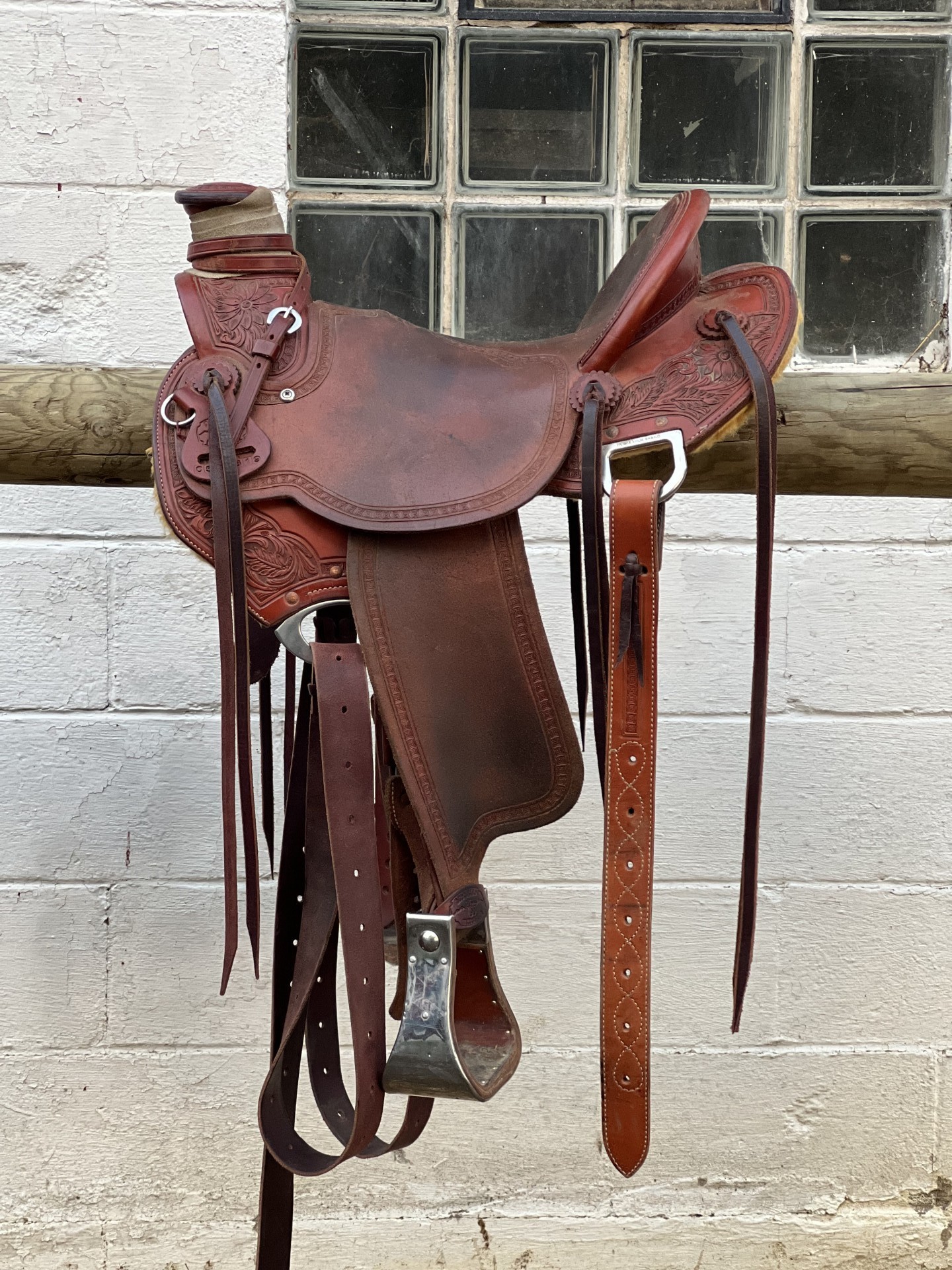 Here is an awesome little 15 inch McCall wade - fits horses like a glove with a regular quarter horse tree - lightweight at about 28 pounds and has 6.5 gullet and skirt is 25 inches at its longest point. Comes with matching back cinch. $3100 and located in Menomonie Wisconsin and shipping available!