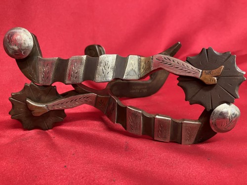 WALT RAMBO AUSTIN, TX marked in unused condition, with 3/4"bands, 2 1/4" shanks, 1 5/8" rowels3 1/2" heel openings. Very well done pair with scalloped bands and ebraved rowels.
