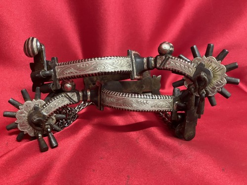 Califonria style spurs in unworn condition marked GARZA. 2" rowels, rowel shields, jingle-bobs, heel chains, 2 5/8" shanks, 2 7/8" heel openings that can be widened. Very usable pair from a collection that came out of California. It was put together a couple decades ago. We pays shipping within the 48 states. We accept most forms of payment.