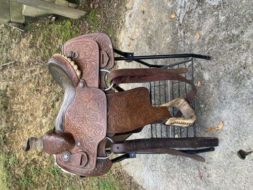 15” Jerry Beagley Calf Roping saddle. Fully tooled in floral tooling.