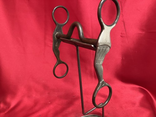 Jerry Wallace JW marked gal leg bit in unused condition from a long time Texas collection. 5" mouth with a lot of work going into it. He tapered the bars down as it goes to the port. The engraving is his typical fine engraving. A very collectible bit, as he is no longer making. He is featured in the Martin’s book on modern makers. We pay shipping within the 48 states. We accept most forms of payment.