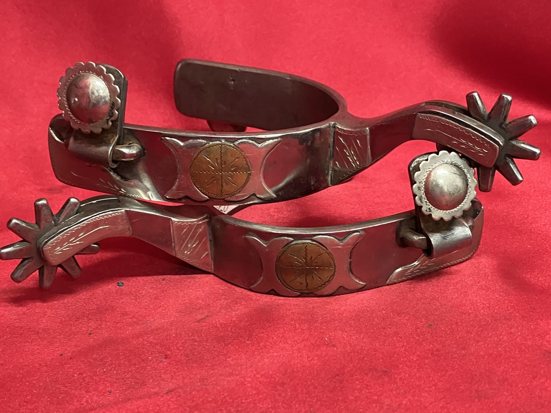 JORDAN 35 marked pair in unused condition. Feature 1" bands, 3 1/4" heel openings, 2 1/4" shanks, 1 1/4" rowels. Good using style and a nice pair. We pay shipping within the 48 states. We accept most forms of payment
