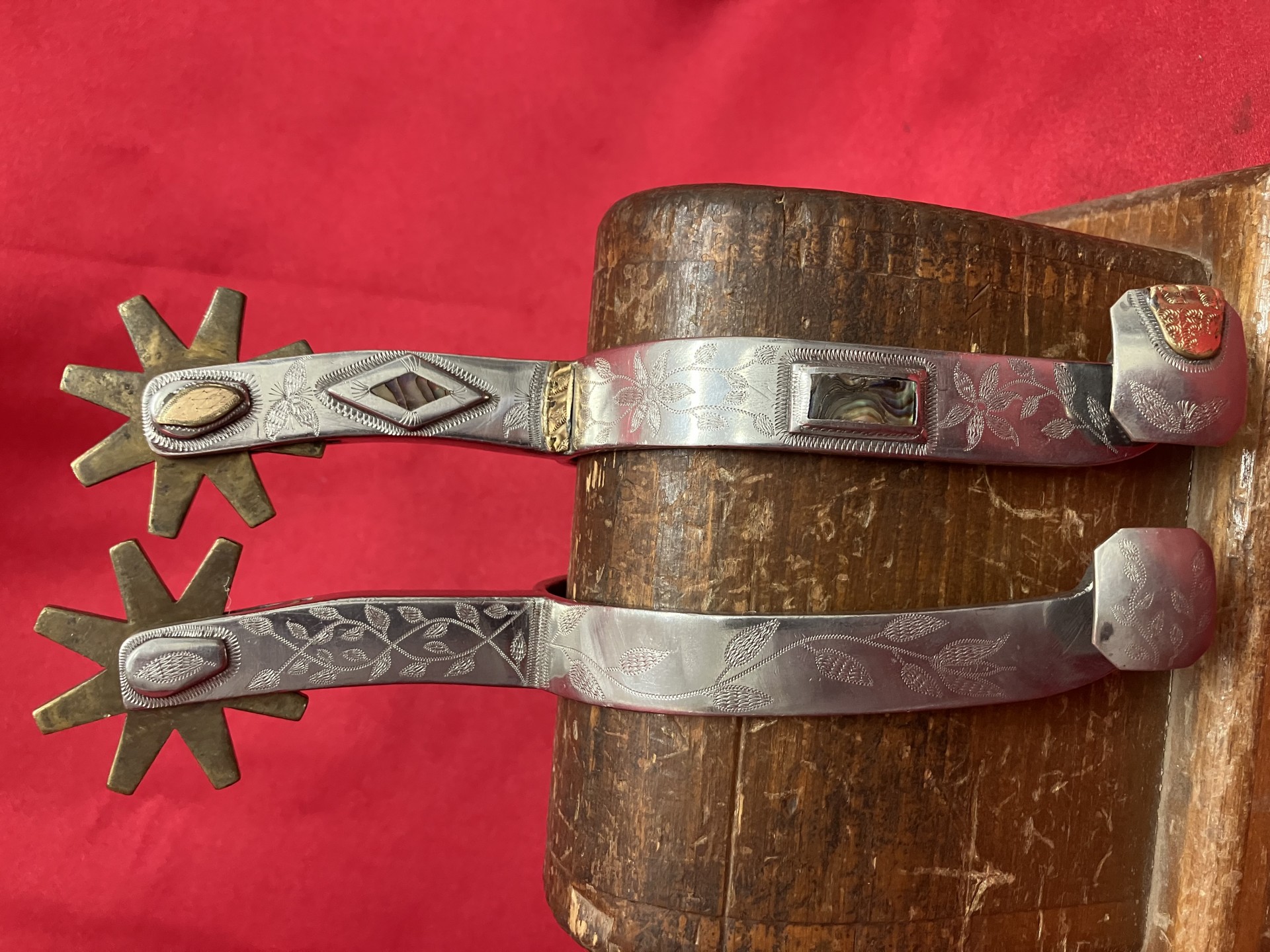 PRISON SPURS!! These were made in Huntsville prison or made by a former inmate after his realease. They have been in a collection for many years and originally acquired from a 90 yo that had them made. He bought some 10K gold wedding bands in pawn shops to have cragted and mounted on this pair of spurs. There are 6 pieces of gold on them. 1 5/8" brass rowels, 2.5" shanks, 3 1/8" heel openings, 5/8" bands, 4 pieces of abalone. Excellent condition. Rare pair. We pay shipping within the 48 states. We accept most forms of payment.