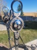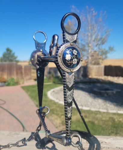Mike Anders Las Cruces Half Breed Bit. My husband had this built for me back in 2012. Beautiful bit, all hand made. Sterling silver and 14k gold inlays. Scroll work on inside of cheeks, staple is laid back just a bit to be more forgiving. Cricket has a lovely sound. Comes with the blued rein chains Mike also built to match.
