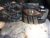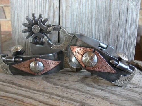 Handmade double mounted spurs by Ray Castleberry of Madill, OK. I am the maker. The boot openings are 3 1/4", heel bands are 1 1/4", shanks are 2 1/8", rowels are 1 5/8" 12-point. Mounted with nickel silver and copper. I accept Paypal or cash. Call or text.