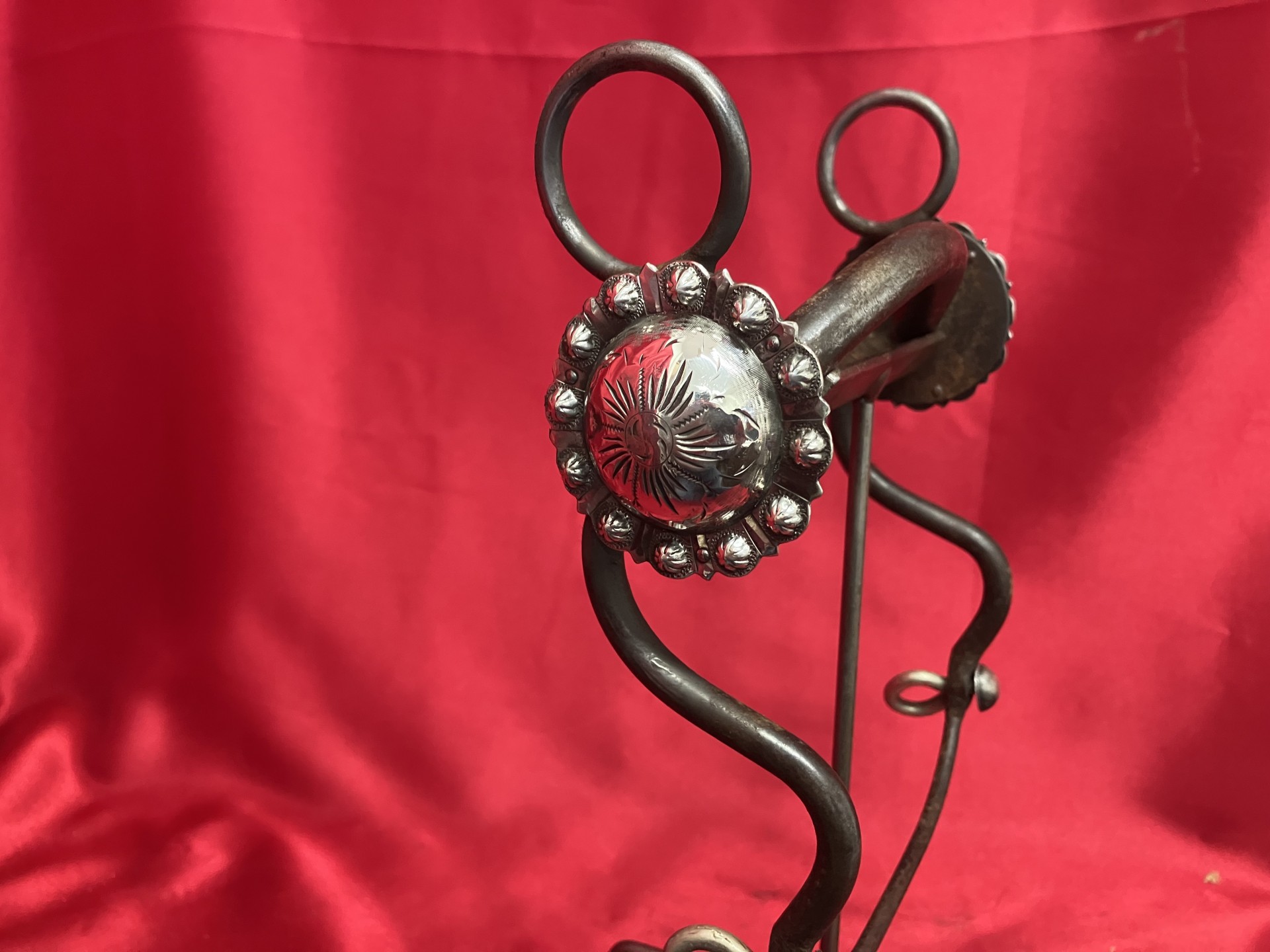 Kurt Rudlebach KR marked bit 2" sterling conchos, 6 5/8" cheeks, 5" mouth. One of the fancier KR bits I have seen. Good condition, with a dent in one concho. I am thinking he is no long making.