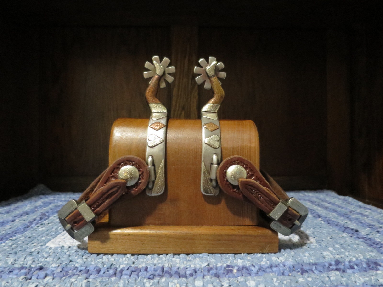 Billy Klapper Gal Leg Spurs #237 made in the early 80’s. Hearts and diamonds and R.M. initials. They had nice patina, but I cleaned them up a few years back. They have been used but not abused, rowels have some wear. All mountings are tight, nothing missing. Don’t see many gal legs up for sale! Pictures show that on one side the Klapper marked KLAAPPPER. 3 1/2" heel openings, 3/4" bands, 1 13/16" shanks, 1 1/2" rowels. Comes with Oliver straps and Kyle Carter buckles. I pay shipping in the lower 48 states.