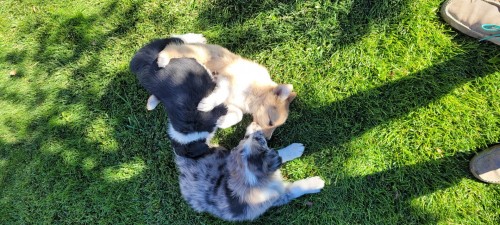 4 Puppies left - all male - 2 black and white, 1 gray, and 1 tan. Dam is Australian Shepherd and sire is McNab both parents are working ranch dogs. These puppies should make great ranch dogs or personal companions. Tails are docked and first shots have been given. 10 Weeks old - Looking for their forever homes!! Phone is a land line number no text please. Email is okay too!