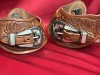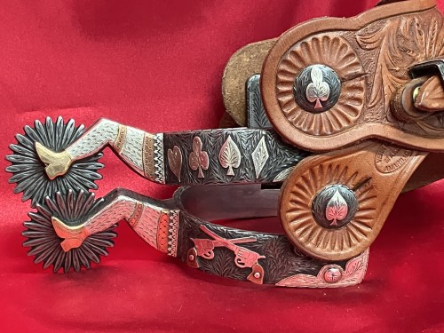 JENNINGS marked spurs and buckles made by Oklahoma maker John Jennings with leathers by the late Vern Martin. This pair is engraved every where they can be, top and bottom of edges, back of the swingers, and the rowels. Unworn condition. Outstanding pair with 1 7/8’ rowels, 1" bands, 2 1/4" gal leg shanks, 3 1/4" heel openings. The matching buckles are also all engraved with the side of the keepers mounted and engraved. Vern Martin was of the best leather crafters I have seen. Great pair!! We pay shipping within the 48 states and accept most forms of payment.
