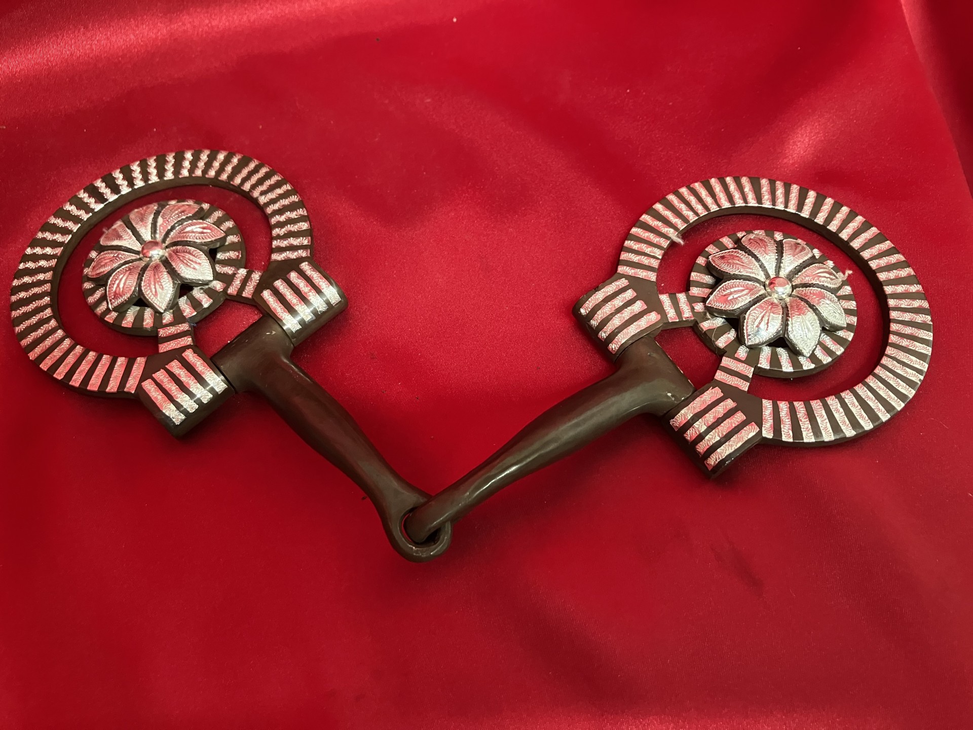 CHARLIES.* marked snaffle bit with copper inlays in the 5 1/8" mouth and pure silver inlaid 3 1/4" rings.