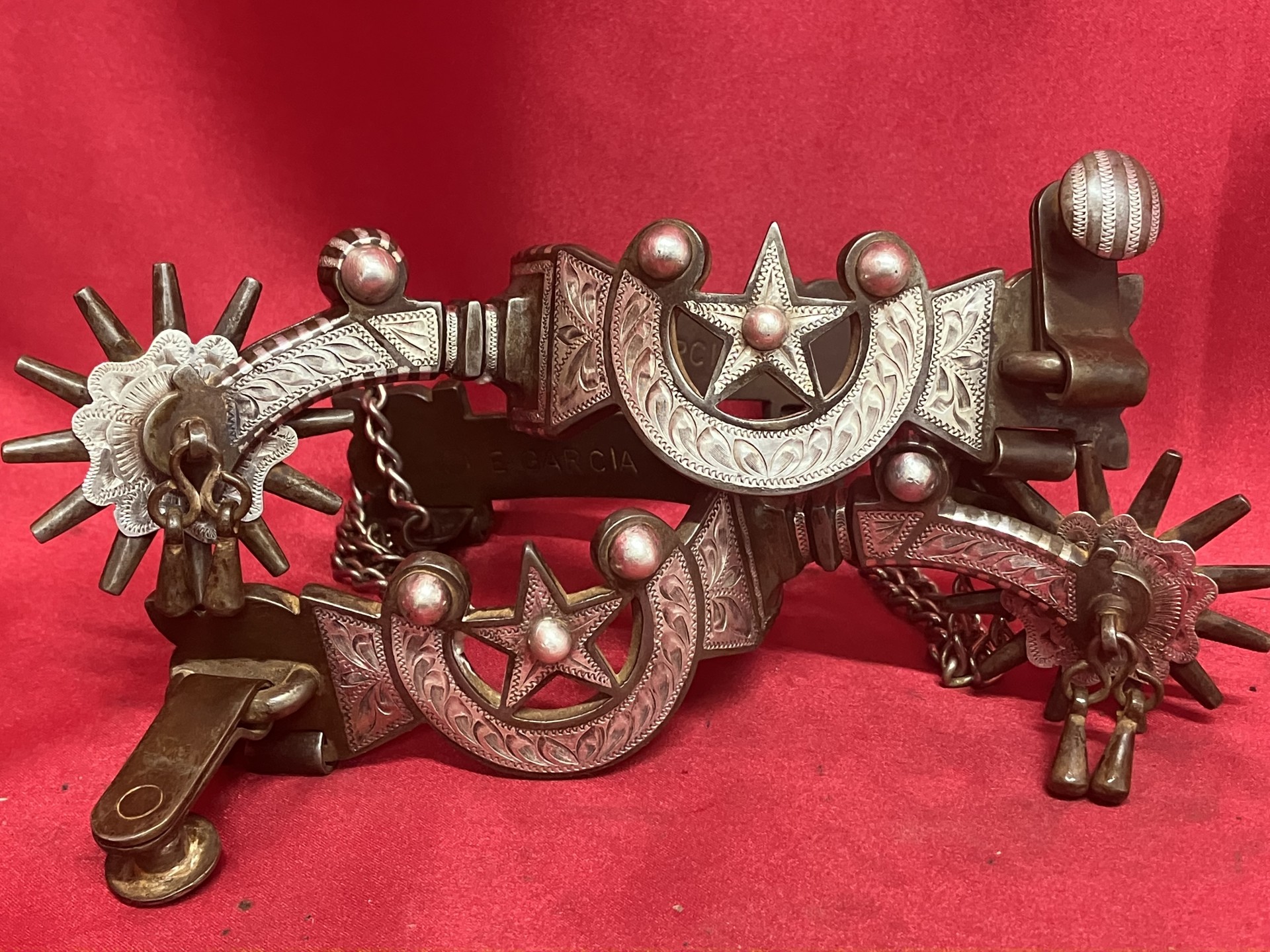 E GARCIA spurs with jingle bobs, 2" rowels, rowel shields, heel chains, 2 1/2" shanks, 3" heel openings that can be widened. Collectible pair in unused condition. We pay shipping within the 48 states. We accept most forms of payment.