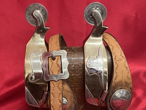 JW 05 marked spurs with JW marked straps. Spurs are brass with silver coin rowels and buttons. The other 2 button covers are Mercury dimes. Sterling overlays on both sides. 1 1/4" bands, 3 1/4" heel openings, 2 1/8" shanks. Fine pair by a top maker, Jerry Wallace of Madill, Ok. Mr. Jerry is no longer making. Also, the silver buckles are marked JW. We pay shipping within the 48 states. We accept most forms of payment