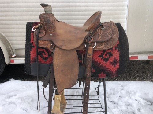 Up for sale is this real nice Paul Van Dyke 16" ranch saddle. Rough out seat and fenders; the rest is fully tooled. Fresh oiled. 4" brass stirrups on turned/twisted leathers. 4.5" straight cantle. Mulehide horn wrap on 3x3.5" horn. Fleece is good. Back cinch included. Buyer pays shipping. Let me know if you have questions. No texts!! Calls only from serious buyer. No trades. Cash or secure funds only.If this ad is up the saddle is still for sale.