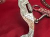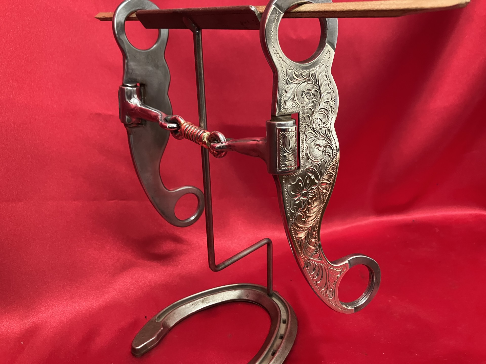 LH marked bit noted Oklahoma maker Leon Hughes. Bit is unused with hand engraved silver and copper overlaid 6 3/8" cheeks and 4 7/8" mouth. His bits are used by of the top hands in and out of the arena. We pay shipping within the 48 states and accept most forms of payment.