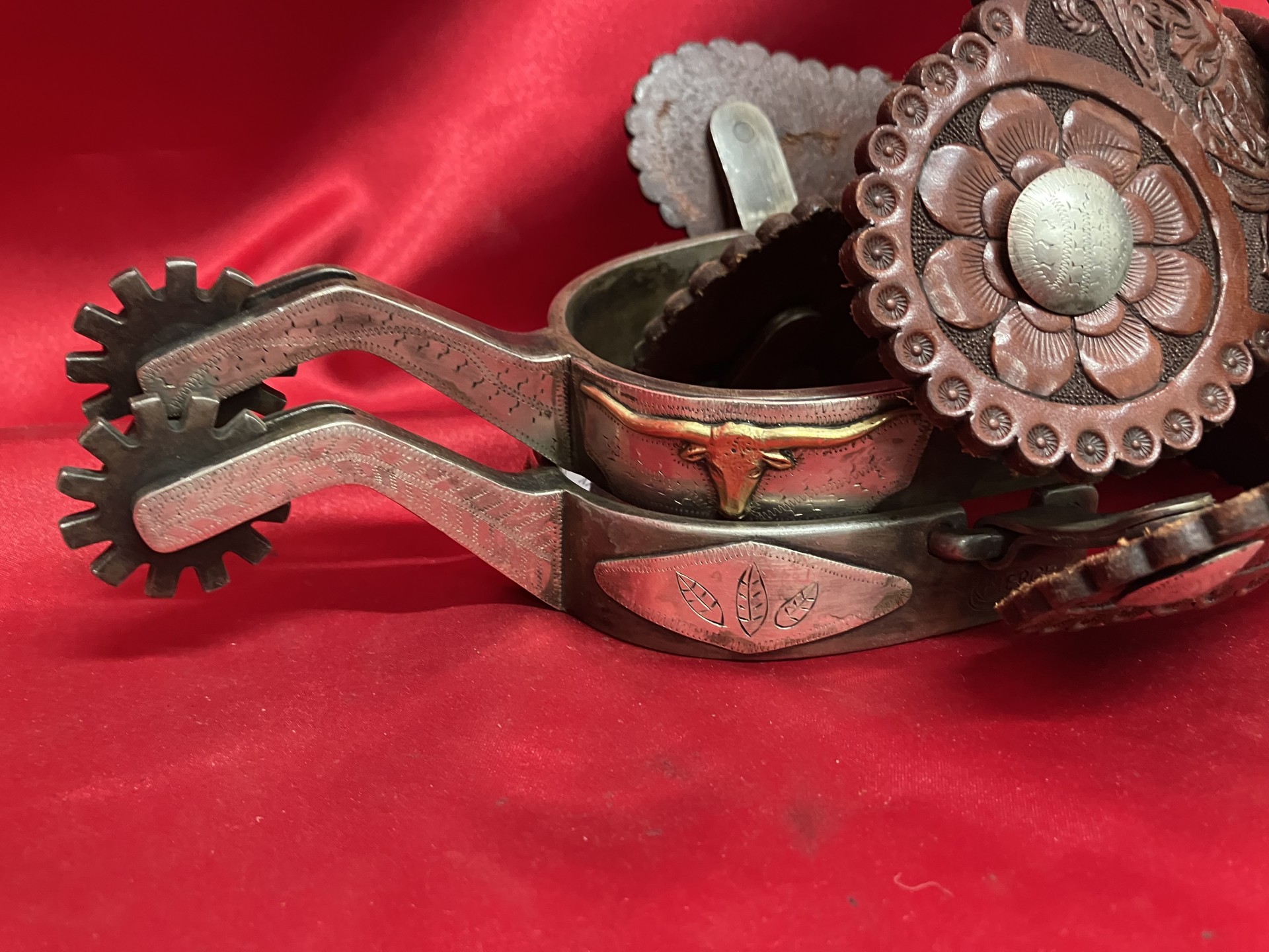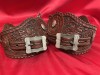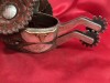 DON PIERCE SPURS & BUCKLES W/JORDAN LEATHERS--PIERCE marked unworn spurs by the late Don Pierce of Colorado. He made the spurs and the buckles and marked them PIERCE. Great pair of hand tooled leathers by noted leather crafter Casey Jordan and so marked. 15/16" bands, 3 3/16" heel openings, 1 1/4" rowels, 2 1/2" shanks. We pay shipping wihtin the 48 states. We accept most forms of payment.