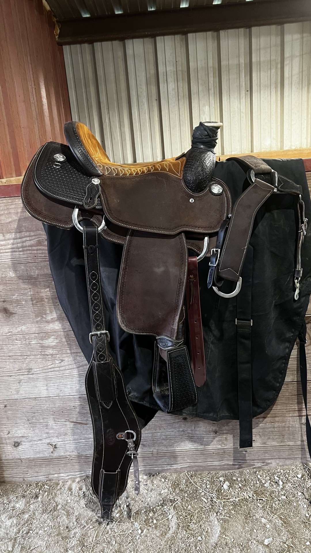 15” chocolate quarter breed Martin saddle. 6 1/2 inch gullet. Cokes with chocolate Martin breast collar to match. 3800$ will pay shipping.