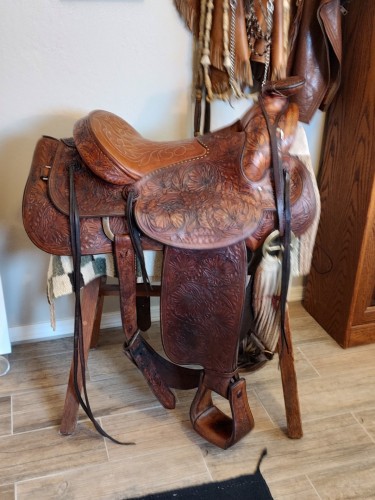 Completely Floral Hand Tooled, 15 ½ in. ¾ Inlaid Padded Seat,20" Fenders, Double Rigged,3" Visalia Stirrups.