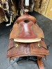 This saddle features a 16" padded leather seat, 3 1/2" cantle with rawhide trim, rough-out fenders, rawhide wrapped stirrups, Full stainless steel Dee rigging on front and Dee rigging on the back, breast collar dee rings with matching heavy duty Martin Saddlery Breast collar, 6 1/2" gullet, QH bars, rawhide wrapped wood tree, post horn, new latigo, new front cinch, heavy back cinch, fleece is in great shape, and weight is around 43 pounds rigged.