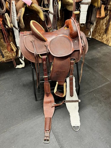This saddle features a 16" hard seat, 5" rawhide bound cantle, 6 3/4" gullet, FQH bars on the rawhide wrapped association tree, post horn, leather rope strap, 14" swells, round skirt, 7/8 drop rigging, 6 long leather ties, rawhide wrapped stirrups, 6" back cinch, new front cinch, new latigo, fleece is good, and weight is around 42lbs.