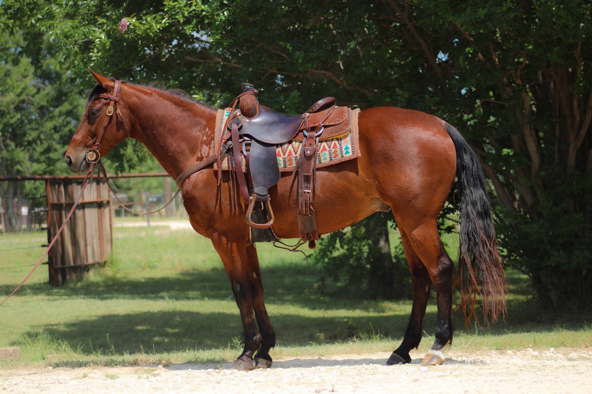 He’s been used outside on the ranch, I’ve checked cows on him, trotted a bunch of miles. He’ll go through water, rides around in the arena nice too, picks up both leads, has a nice stop. Just ready for someone to take him & go on with him! This guy has got some major speed & is super gritty, great prospect for barrels, team penning or roping.