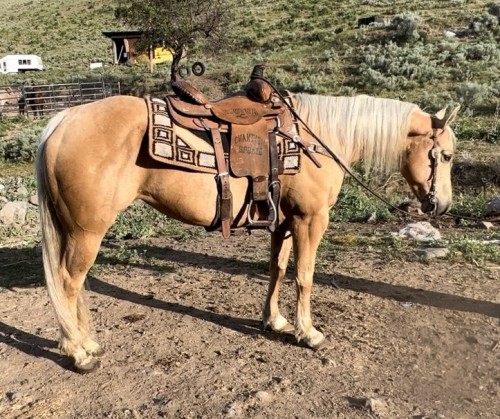 This is a big, shapey, golden palomino mare. 15.1hh and built stout with a super long mane and long thick tail – she gets noticed everywhere she goes! She is a very nice, laid back mare that has been ridden on the ranch to do chores. Gathered horses, cattle and ponied colts with her. Very sure footed in steep and rocky country. Not barn or buddy sour. She is a nice mare most anyone could get along with! She also comes with a great pedigree with Nu Chex To Cash, Mr. Sam Peppy, Colonel Freckles and King Fritz in her pedigree. She would make a great addition to anyones broodmare program. She’s a nice, sound mare. If you want to breed her, ride her, or just have a pretty horse to look at, then she will not disappoint you!