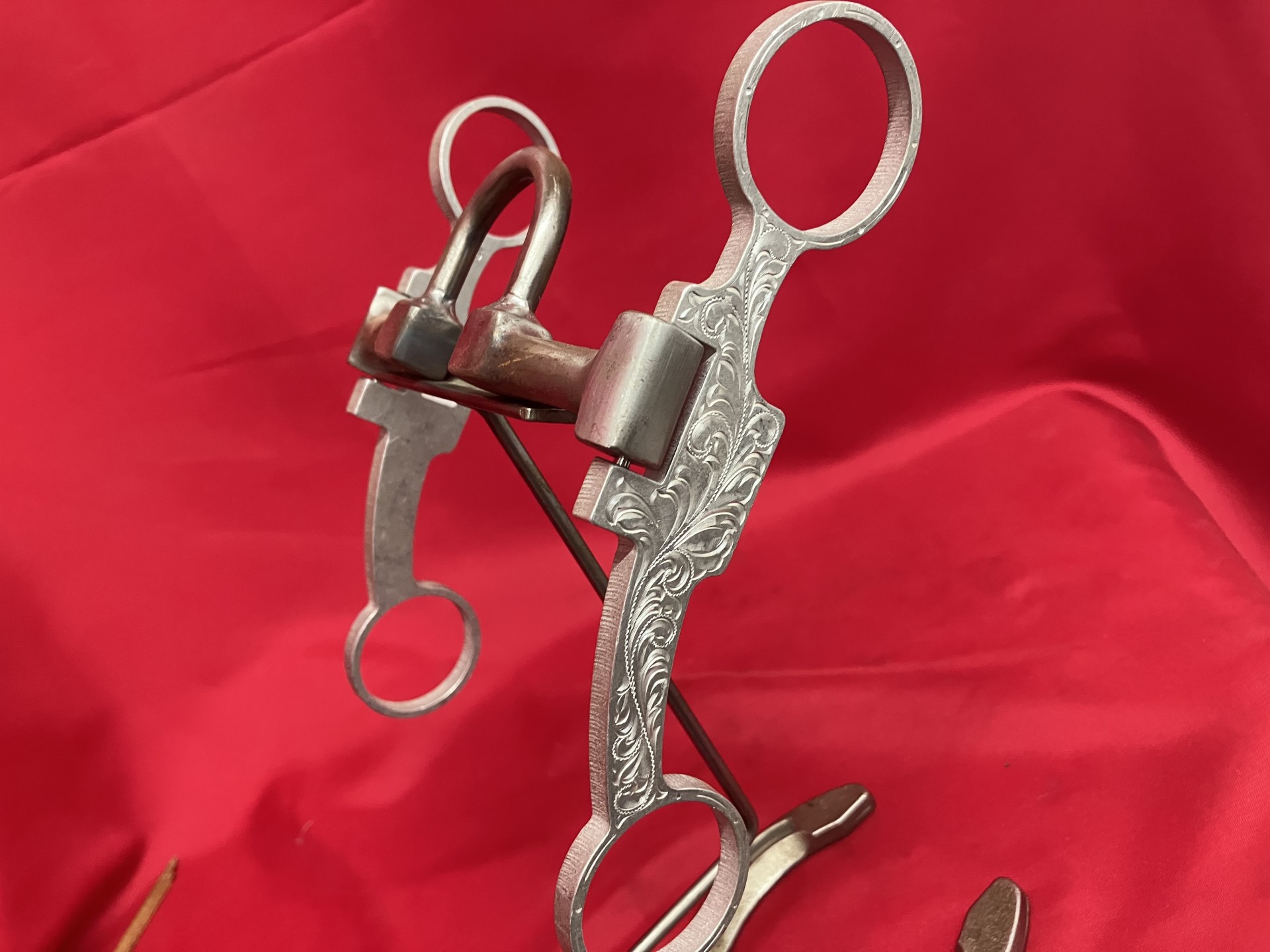 KG marked bit by Kenny Giannini with engraved 7 3/8" loose aluminum cheeks and 5 1/8" correction style mouth that he welded stiff. Has just a bit of contour. I use one like it and it has a lot of feel. Horse really works good with it. We pay shipping within the 48 states and accept most forms of payment.