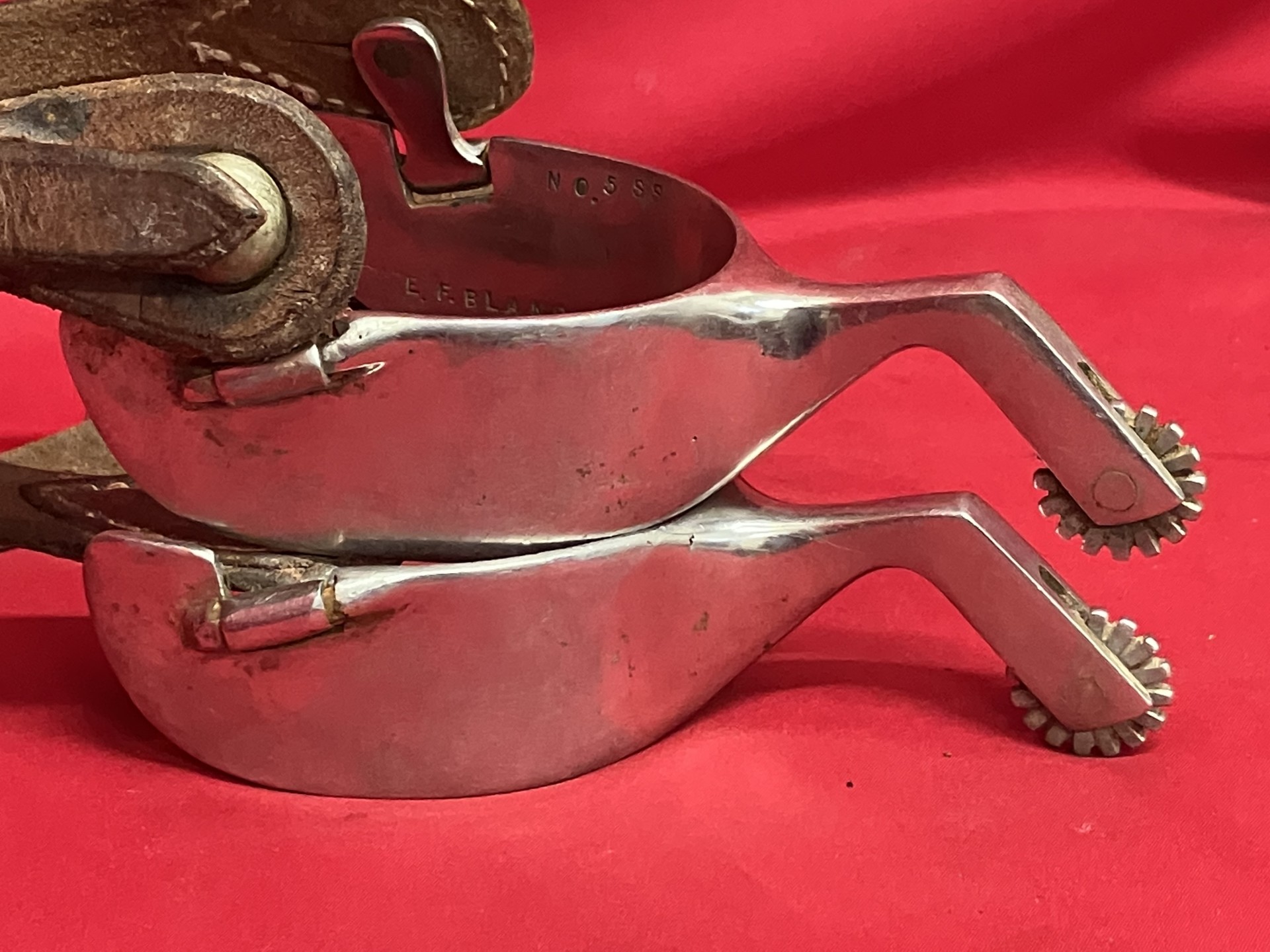 Pair of E.F. BLANCHARD YUCCA-ARIZ NO.5 SS marked spurs in good condition with with original rowels that are tight. 3 31/16" heel openings that can be widened, 1 1/2" bands, 1" rowels, 2 3/4" shanks. Highly collectible pair. We pay shipping within the 48 states and accept most forms of payment.