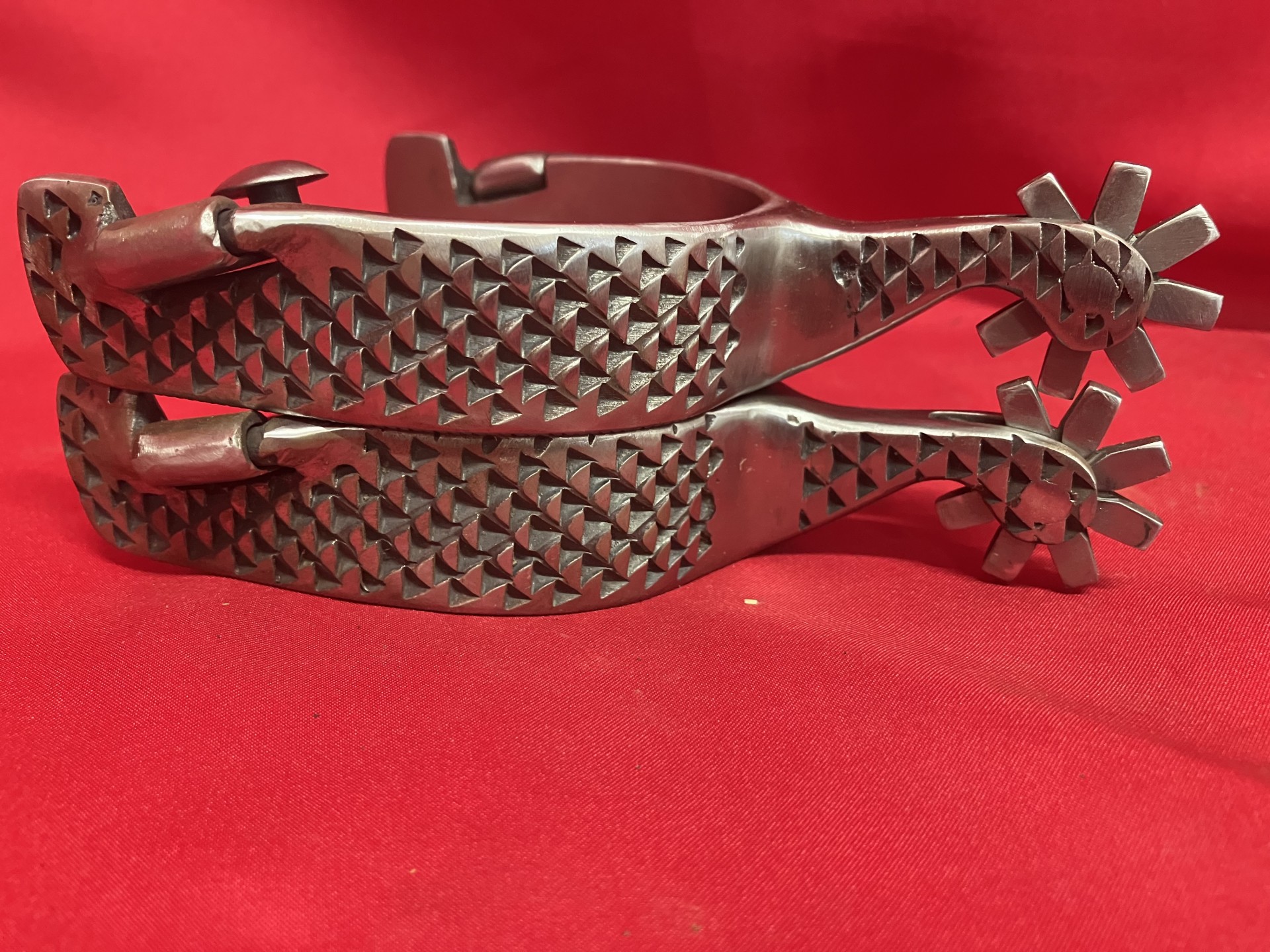 DAN 2023 marked rasp spurs in unused condition with 1" bands, 1 1/4" rowels, 1 7/8" shanks, 3 7/16" heel openings. Made to use and to last. He does a great job of making and keeps the price affordable. We pay shipping within the 48 states. We accept most forms of payment.