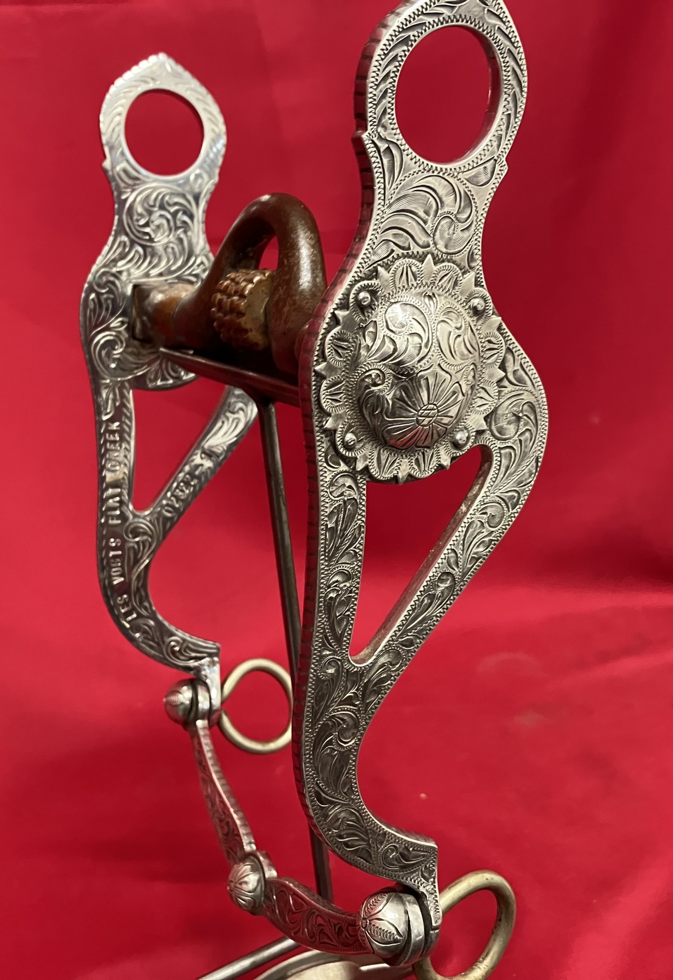 LES VOGTS FLAT CREEK 02322-9 marked bit in very good condition with 7 3/4" cheeks that are real silver overlaid with inlaid edge silver and engraving inside the cheeks. 5" mouth with copper rollers on the bars and 5 copper rollers. Silver overlaid solid lip bar. Small dent in one concho. We pay shipping within the 48 states. We accept most forms of payment.