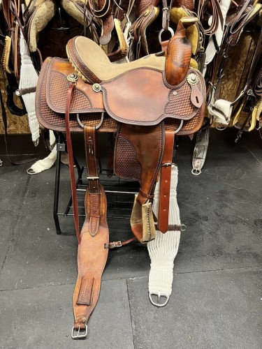 This saddle features a 15" padded suede seat, 4" silver laced rawhide bound cantle, Full stainless steel Dee rigging on the front and back rigging, 6 1/2" gullet, QH bars built on the rawhide wrapped wood tree, post horn, Dee rings on the back conchos with new leather ties, rawhide wrapped stirrups, back cinch, front cinch, fleece is in great shape, and weight is around 37 pounds.