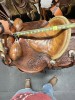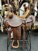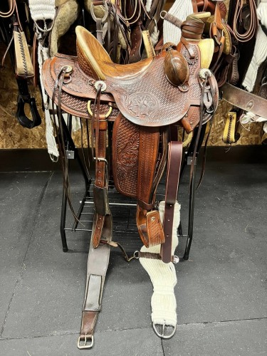 This is a looker! The leather work done on this custom rig is simply gorgeous. I’m finding these saddles in used condition for over $4k, so this is a price you don’t want to miss out on. This is a steal of a deal for a custom rig! Also, with that high back and bucking rolls it fits more of a 15" seat.