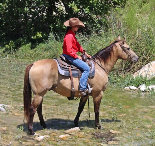 If you are looking for a really broke, fun horse to ride on the ranch or take on trails, something good looking enough to grab everyone’s attention when you ride by, then take a look at Sundance. He is a stout, beautiful 12 year old buckskin gelding, 15.1 hh with a ton of shape and that good cowboy color. He is big boned with a good size foot, and plenty of personality. Sundance came off of a ranch in North Texas, where he was used to ride pastures, check fences, sort cattle and pony colts. He was purchased 3 years ago by a family friend, who only used him to periodically ride around his ranch. He’s too good of a horse to sit around and go to waste, so he is looking for a new owner to enjoy him. Sundance is a blast out on the trails. He is sure footed, crosses water with no problem, and will go up, over or through anything you point him at. He rides quietly on a loose rein, never going any faster than you ask him to, but is plenty responsive when you want him to be. Sundance is very well broke with an excellent neck rein, knows his leads, stops easily, and will work off leg pressure. He has been taught to travel out and cover some ground, and will happily ride in the front, middle, or rear of the pack. He has been on huge multi-day trail rides with wagons, flaggers, and all the commotion that goes along with that, and nothing bothers him or spooks him. Sundance has excellent ground manners, is perfect for the ferrier, will stand quietly tied, and loads and hauls well. He gets along great with other horses, will ride out alone as well as with a group, and doesn’t mind being separated from the group while riding. He has been ridden down the road and in traffic and isn’t bothered by it. Asking $9500. Call Wendy for more information at 210-363-1883. Serious inquiries only, no tire kickers! Vet checks welcomed. Delivery anywhere is the US is available.