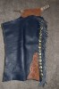 Very nice handmade show chaps; medium blue color with 3 1/2" fringe the full length of both legs, brass conchos the full length of both legs, heavy duty brass zippers the full length of both legs, and hand beaded inserts in the belt. Full floral tooling; the pocket is just for show and does not open. Maker marked HARPER’S SADDLERY FARMINGTON, N.M. Made for a smaller person / youth. The waist measures approx. 34" around at the smallest adjustment hole, with 4 holes and about 3" of additional length to go larger. The legs measure about 12" across at the top (zippered) and about 10" across at the bottom (zippered). Unzipped and open the legs are 23 1/2" across at the top and 20 1/2" at the bottom. Overall length is 38" long from the top of the belt to the bottom of the leg. Good overall condition; do not appear to have been worn much, if at all.