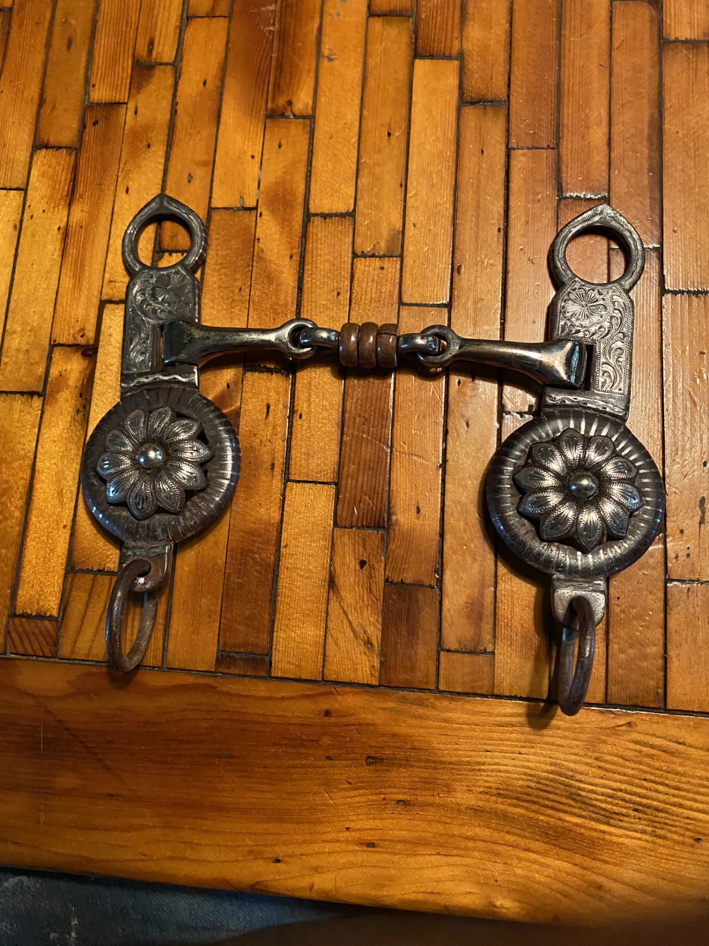 Bill Hill Reata cactus rose concho ,hand engraved sterling silver, dog bone snaffle. Never used but sat in a barn for years. Will pay. Priority mail in lower 48 states. Prefer PayPal.