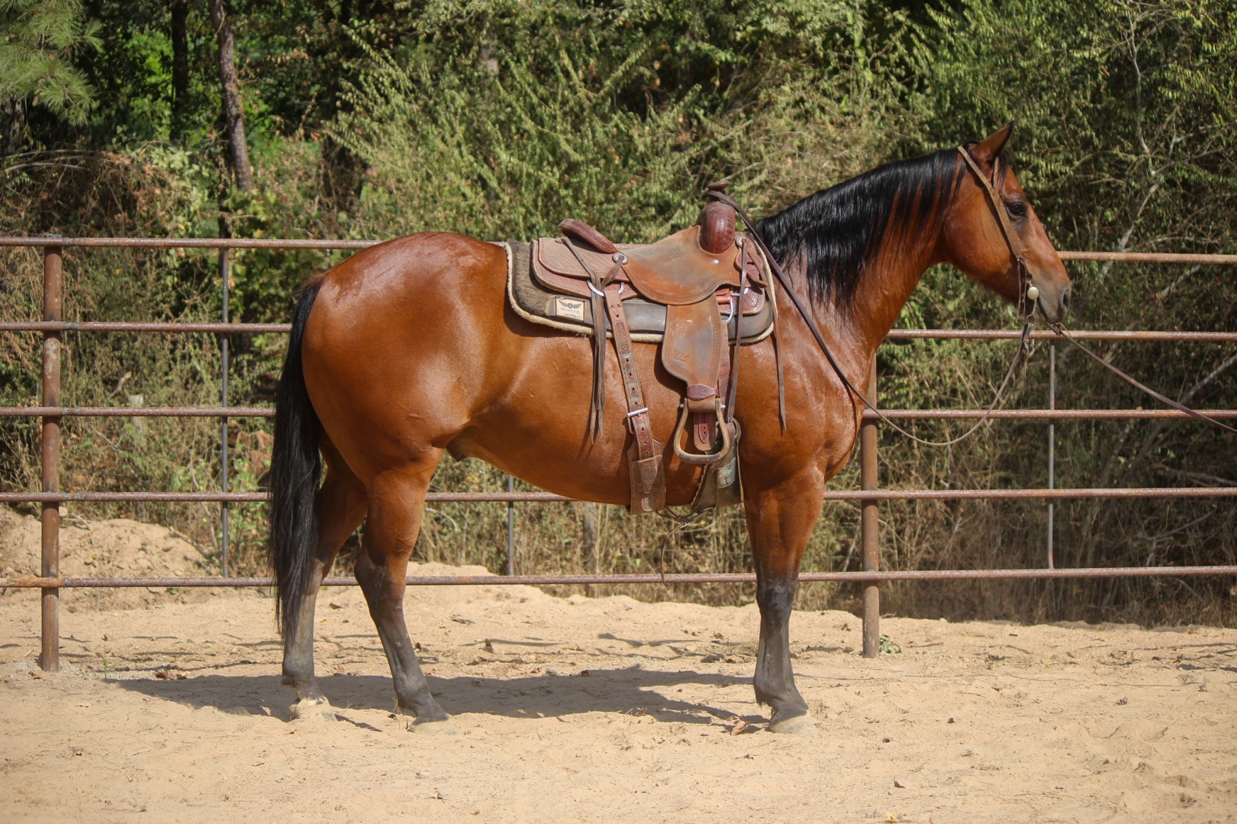 15hh and stout. He is quiet and good to be around. He has been used for basic ranch work outside, he has sorted and gathered cattle. He has also been trail rode some. He is smart and willing to learn and ready for a job!