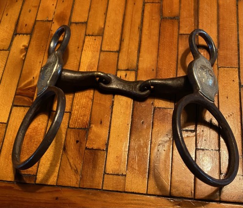 Rare Silver engraved “sunflower “ design globe ring,dog bone snaffle. Marked R.F. Ford and 327.. by the late spur and bit maker from Watervalley,Texas. In 1996, he was named Spurmaker of the year by the Academy of Western Artist., the very first spurmaker to receive that award.. He is also featured in the book “ Bits &Spurs ,motifs,techniques and Modern Makers by Ned and Jody Martin. Priority mail to lower 48 states paid by me. Prefer PayPal.