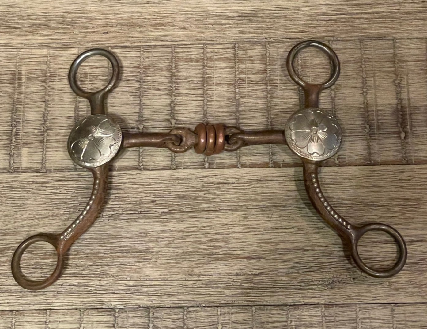 Pat Vaughn dog bone snaffle with copper rings. Marked P^ on one shank and 181 on the other. Includes shipping within the 48 states