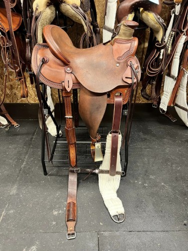 This 14.5’ rough-out hard seat, 6 1/2" gullet, QH bars, wade tree, mule hide wrapped horn, in-skirt double rigging, round single skirt measuring 24" in total length, back cinch, new off billet, new front cinch, new latigo, 4 long leather ties, pre-twisted metal bound wood stirrups, breast collar dee rings, rough-out fenders, fleece is good, and weight is around 20lbs.