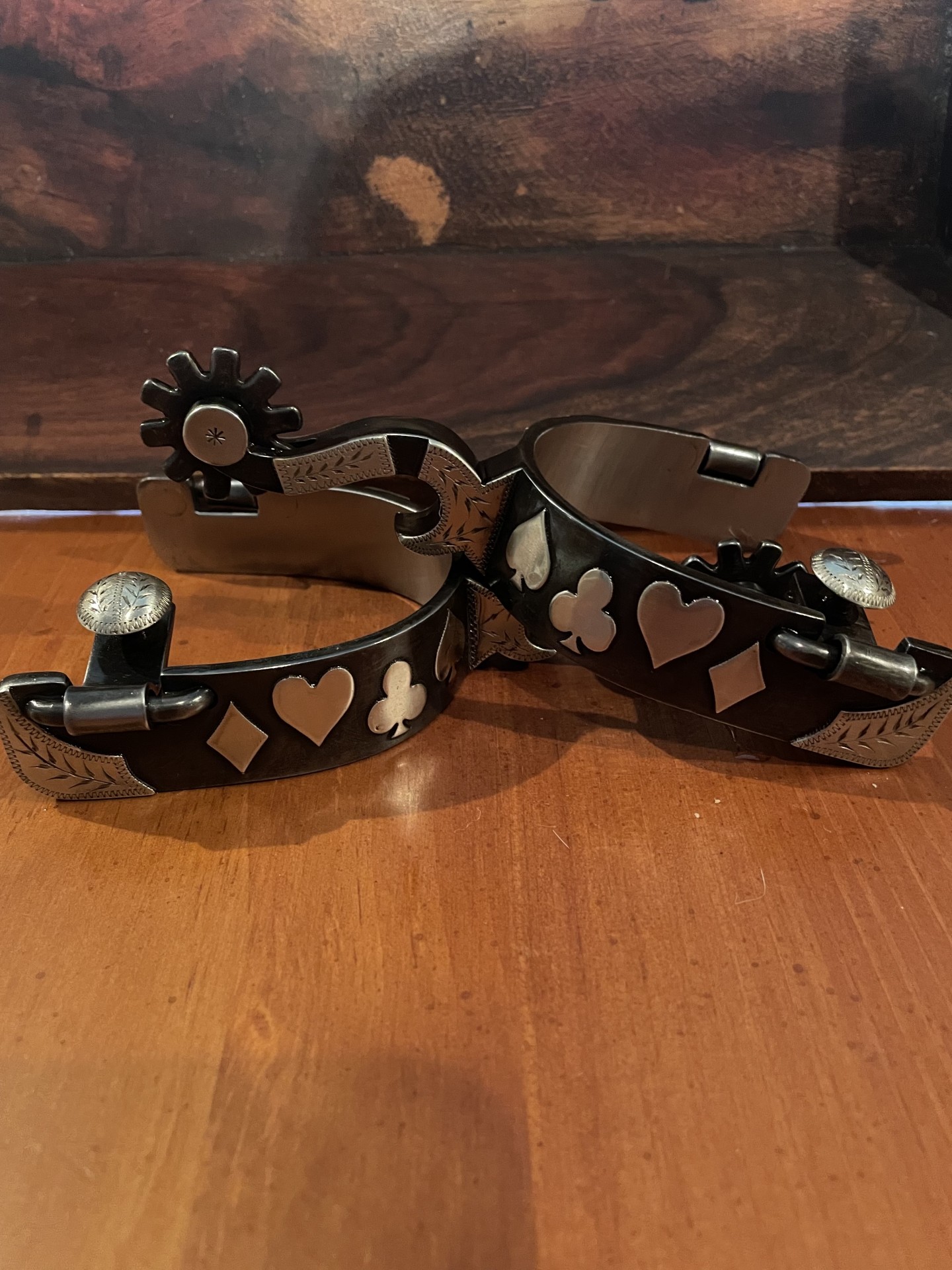 Handmade double-mounted card-suit working spurs. I am the maker. Marked RC. The openings are 3 1/4”, heel bands 1 1/16”, bottle opener shanks 2 1/2”, rowels 1 1/4” 10 point. Call or text.