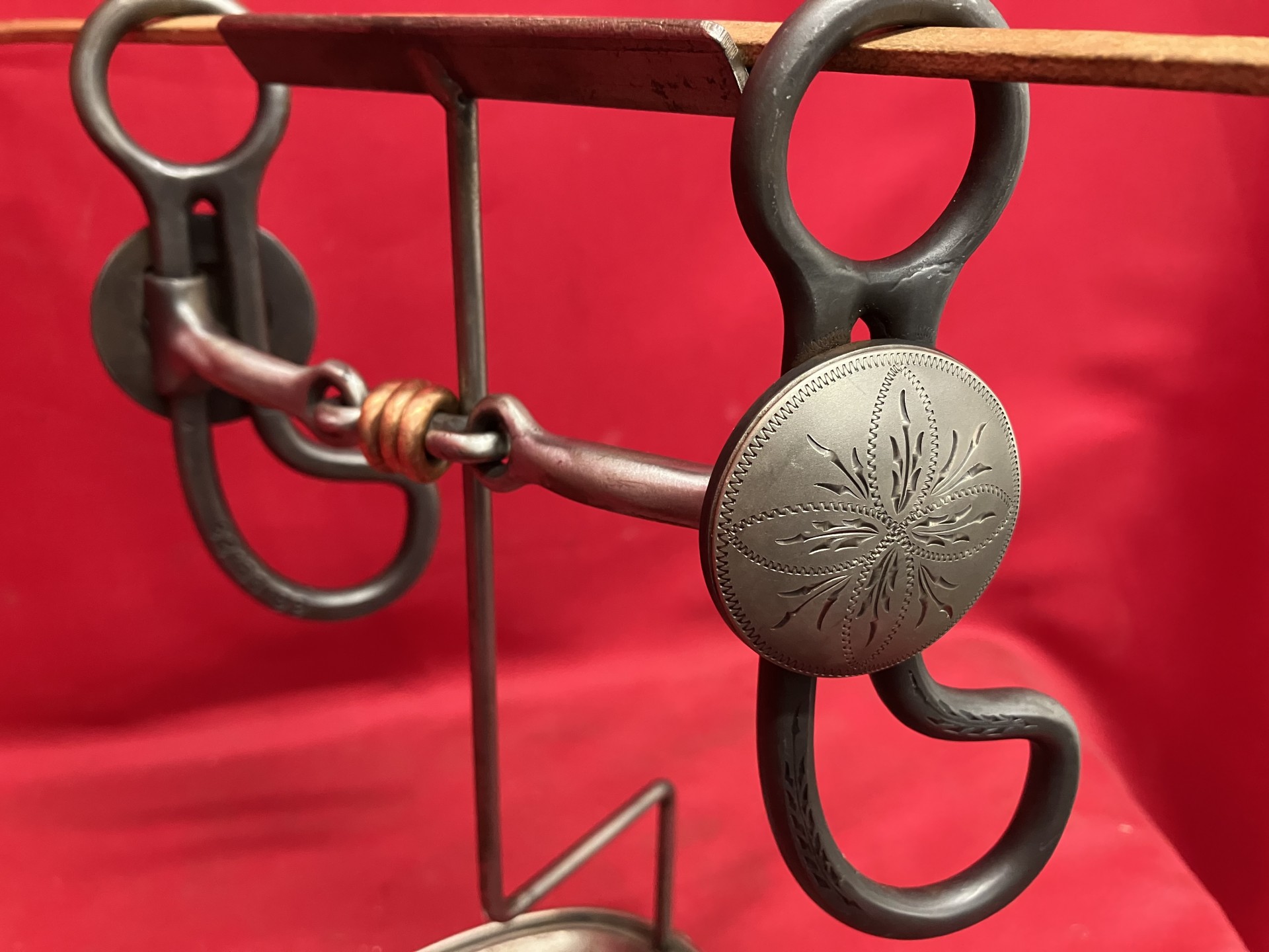 Very nice bit by Gary Wiggins that is marked WIGGINS 66.DB.23 and features 4 7/8" mouth and 5" mouth. Gary is an award making bit and spur maker and his finish work is well above many. We pay shipping within the 48 states and we accept most forms of payment.