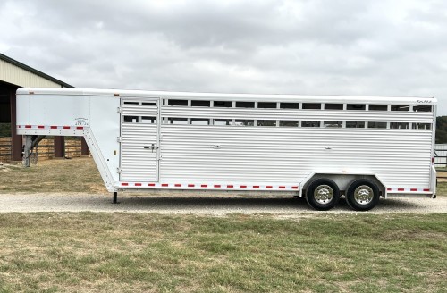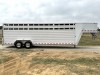All aluminum, 2005 Exiss 24’ stock trailer and horse trailer. This trailer has a total box length of 24’ with 2 cut gates making three 8’ boxes. Both cut gates have slam latches as well. The rear door is one large swing door with a slider in it. The trailer is 7’ tall and wide. Priced at $16,900 and located in Aubrey, TX with delivery available.
