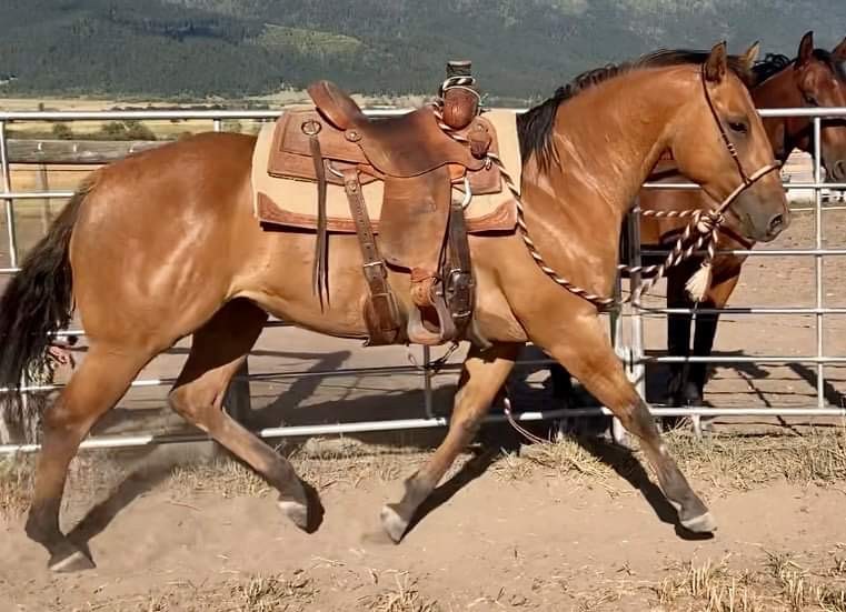 Real Gentle Well built and bred ranching mare. 4 y/o 15.1. 1000ish lbs. Might only be 4 but can and will do everything expected of a finished ranch horse. Nice ground covering walk and trot. Will go all day. Tracks cattle. Safe to rope off of. Even for beginners. A lot of pulling power. Stands quiet tied. No pawing. Not heardbound- no nickering for other horses. Easy to catch in a big corral. Roped other horses off her and snubbed others up to her. Packed off of amd hobble broke. Roped bulls. Soft handle. Collected stop and back. Fine with traffic and trailing cattle down the Highway. Came from Flyin X ranch in Texas. A lot of their weanlings go for over $5k. Her value will only continue to increase. Perfectly sound. have all vet records and PPE is welcome. Come try her out. Text or call me for more videos or info. Located in wolf creek, MT 35 miles north of Helena