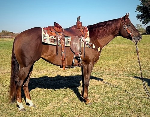 Halli Berry is a stunning dark chestnut mare that has class and charisma written all over her. She is very sweet minded, gentle and a blast to ride. This fancy girl is one that truly checks all the boxes. She was originally started in a working cowhorse program. She has the handle and all the fancy buttons you would expect from her background. She’s super cowey. She would make the perfect AQHA Ranch Versatility, SHOT or WRCA mount. She would also do great in the AQHA ranch riding, ranch trail and kick their butts in the performance halter. Her sire Trixies Sixes is a very accomplished show horse and Halli has what it takes to follow in his footsteps if you choose to take her in that direction. Her previous owner decided to take her the ranching route instead of the show circuit route. She’s an accomplished ranch mare that is no stranger to long days and being called on for multiple tasks. You can gather big pastures on her. You can pen and sort pairs on her. Go prowl on her looking for strays. Load trucks on her no problem.