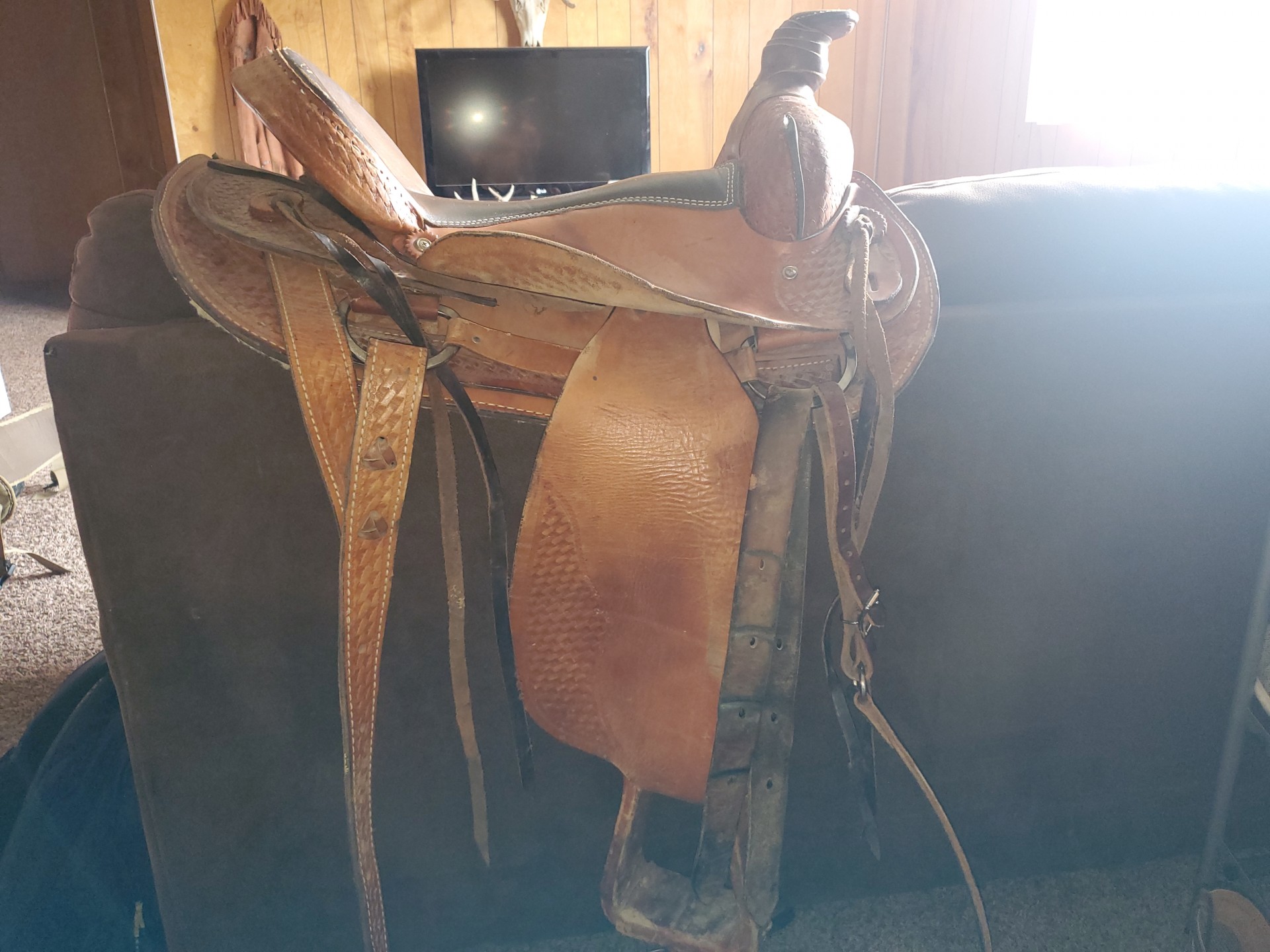 17" 0550 Dakota Roping saddle. Sheep skin and stirrups are like new. Great saddle, the back cinch is reinforced for roping off of, just too big for me. Just needs oiled.
