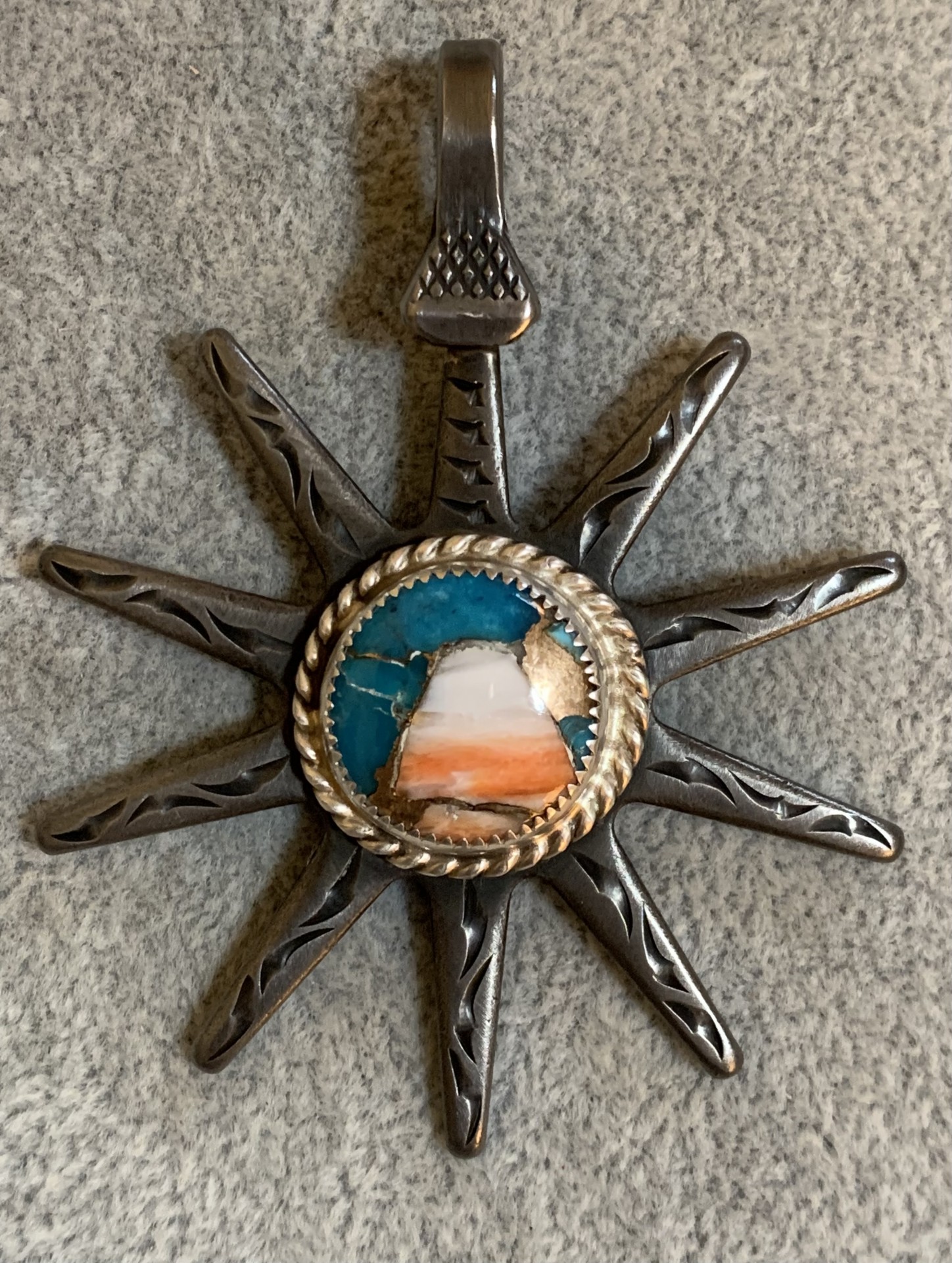 ( # 6 ) Beautiful western style pendant handmade by JD Moss. The pendant is a 10-pt steel spur rowel set with a high polish orange dahlia cabochon. The stone is set in 925 sterling silver sawtooth bezel with 925 sterling silver rope border. The bail is made from a horseshoe nail. The pendant is marked on the back JDM. Overall length including the bail is 2 and 5/8 inches, the width is 2 inches, and the bail can accommodate a bead size of up to 7mm so this pendant can be worn on a variety of necklaces.