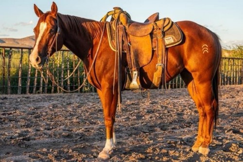 Ccc Dual whiskey aka “Swayze” is a 4 yr old sorrel gelding . Standing at 14.2 weighing 1050 with big bone and feet . Swayze is a finished ranch horse that is gentle enough for anyone to ride . He has been ridden by a 2 year old and a 4 year old all over and he is a great babysitter and he will take of anyone that is on his back . Great in the rocks, easy to shoe. A good one for anyone to catch no matter the job . Break away /heel horse prospect . Swayze is listed by Shores Creek Performance QH. . Feel free to call or text Justin Fitzgerald, Horse Manager and Trainer with any questions!