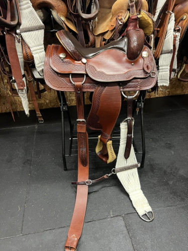 These saddles are some of the toughest ropers out there. The trees in these have a really nice narrow twist which is fantastic for all day rides. Also, they fit horses right and ride like a dream. They will do the job for anything you can catch! This saddle is nicely broken in and ready to get to work on the ranch, arena or on the trail. You won’t look back after buying one of these Crates saddles. If you like the feel of a Reiner but want a tough enough tree to work on here it is.