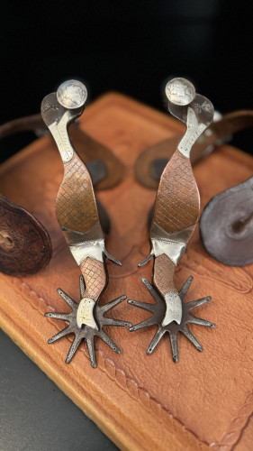 Handmade Bits & Spurs for Sale: Vintage 1940’s "L.J. Church" Double Mounted Gal Leg Spurs w/ Silver & Copper Inlay SOLD #178528