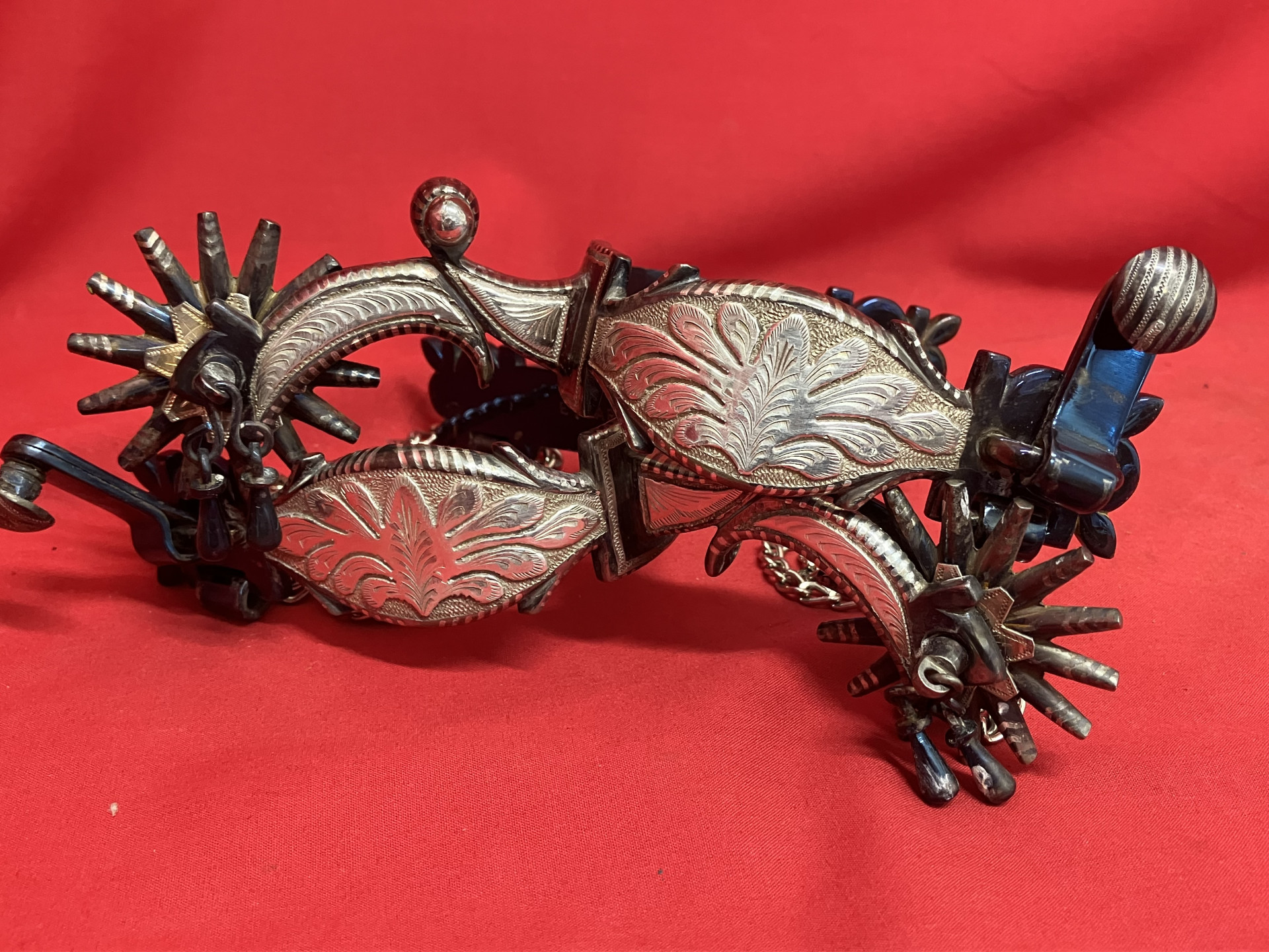 E GARCIA spurs in unused condition with heel chains, jingle-bobs, silver rowel shields, 2" rowels, 2 7/8" shanks, 3" hel openings. Silver inlays in the rowels. Have a great look. We pay shipping within the 48 states. We accept most forms of payment.